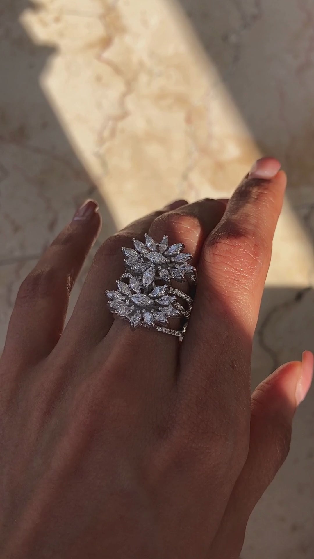 In the graceful tapestry of light, the Glitzern Ring stands as a testament to timeless allure. Delicate marquise-cut stones converge in a mesmerizing motif, evoking the brilliance of a promising future. With two motifs delicately repeated and a slender band adorned with five lines of shimmering round stones, this ring epitomizes sophistication and grace. A radiant symbol of elegance and luminosity, the Glitzern Ring illuminates your path with its captivating charm.